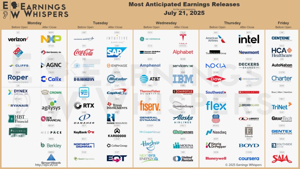 • Verizon Communications Inc. (VZ): Verizon is set to report its second-quarter 2025 earnings with consensus estimates calling for earnings per share of $1.18-$1.20 and revenue of approximately $33.74 billion, reflecting 2.8% year-over-year growth.