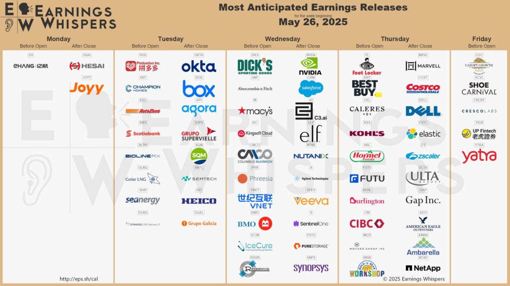 • NVIDIA Corporation (NVDA): Nvidia will report its earnings with analysts expecting earnings of $0.74 per share on revenue of $43.30 billion, representing 21.3% and 66.2% year-over-year growth respectively, though results will include a significant $5.5 billion charge related to unsold H20 chip inventory due to U.S. export restrictions to China. Market participants should focus on data center revenue performance, gross margin trends (expected around 71%), and critically, the company’s Q2 guidance, which analysts project at approximately $46.51 billion in revenue, as supply constraints for Blackwell chips and the ongoing impact of China trade restrictions remain key uncertainties. Market participants should also watch for updates on Blackwell chip production ramp, AI demand sustainability, and management’s commentary on navigating geopolitical headwinds.